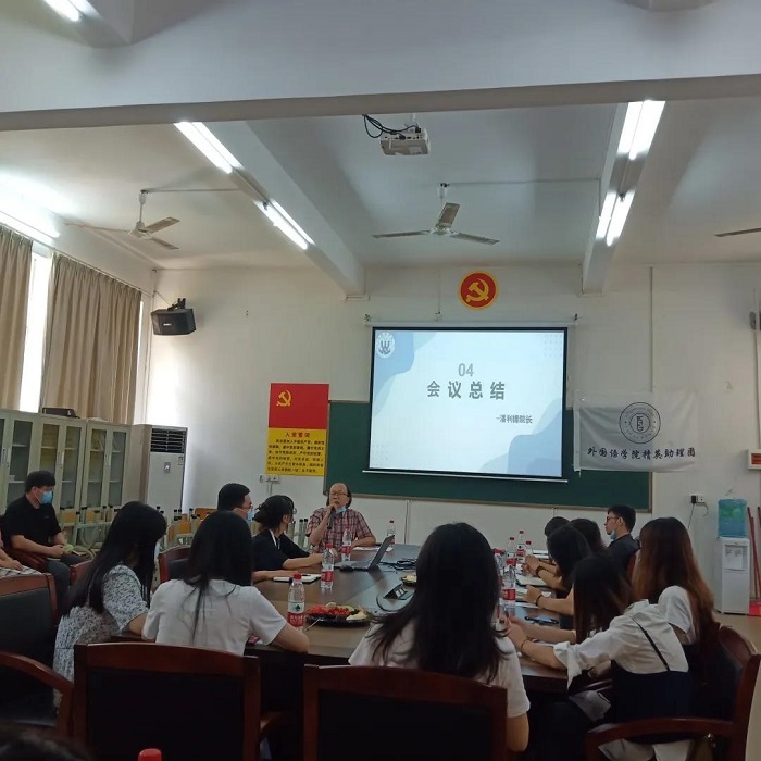 本网讯(外国语学院新闻中心)6月8日,外国语学院在37栋37101会议室召开的师生座谈会。参加本次座谈会的人员是:外国语学院院长潘利锋教授、党总支吕丽红书记、郑建蓉副院长、王泽熙副院长、吕媛副书记、各教研室主任、各年级辅导员、教师代表以及班级学生代表。根据防控需要,大家都主动佩戴口罩,做好防护措施。