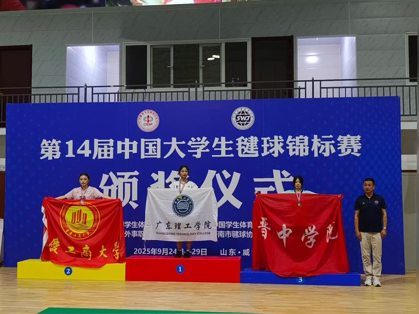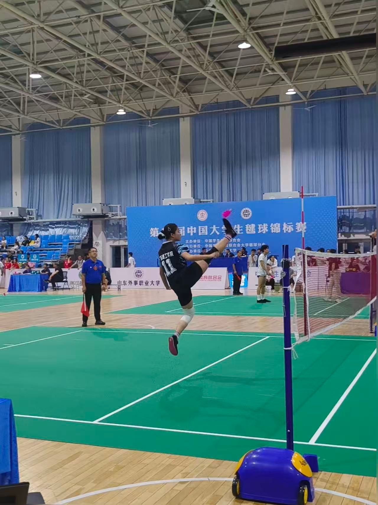本次锦标赛于2025年9月22日至29日在山东外事职业大学体育馆举行,由中国学校体育联合会主办、山东外事职业大学承办,是国内高校毽球运动的顶尖赛事之一。赛事吸引了全国47所高校的高水平队伍参赛,围绕毽球、平踢毽球、花式毽球三大类别展开激烈角逐,赛场氛围热烈,竞争极具观赏性与挑战性,为各高校毽球健儿搭建了交流竞技、展现自我的优质平台。Beat365派出4名运动员参赛,体育学院党委副书记刘涛担任领队,教师张丽娟担任教练。