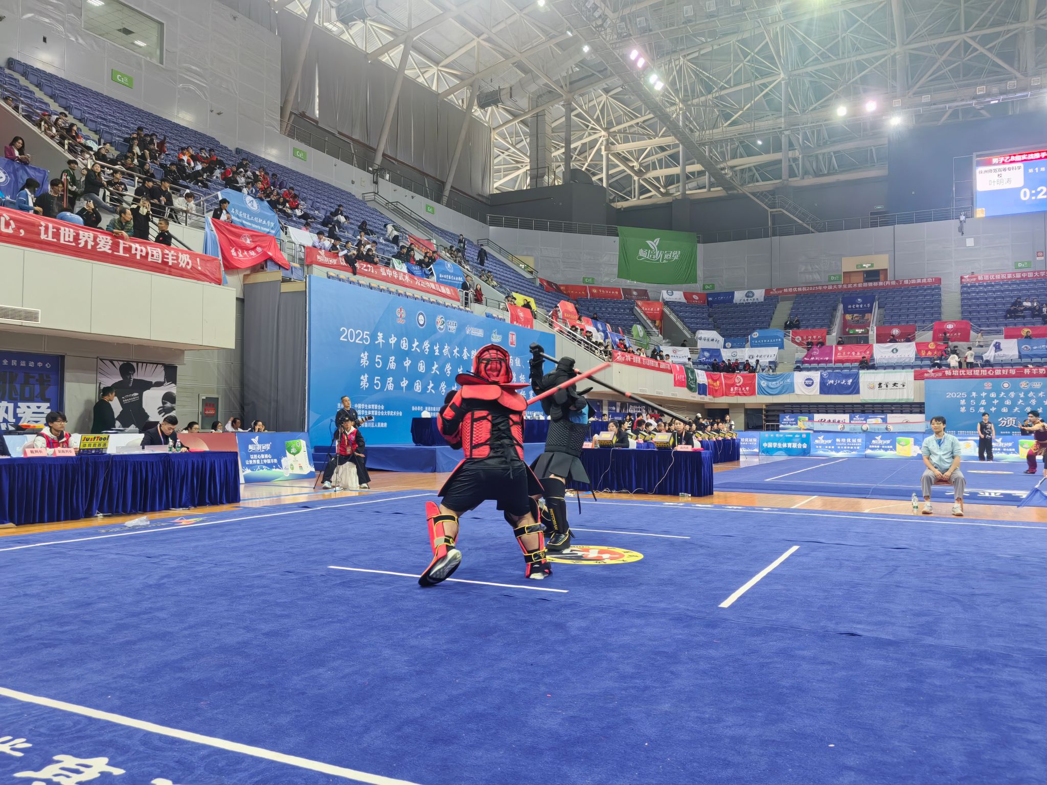 本网讯(体育学院)2025年10月25日至11月1日,第五届中国大学生武术长短兵锦标赛在江苏省南通市隆重举行。本届赛事由中国学生体育联合会主办,共吸引全国94余所高校的981余名运动员参赛,规模再创历史新高。比赛设甲A、甲B、丙组三个组别,涵盖长兵、短兵多个公斤级项目,全面展现了当代大学生精湛的武术技艺与昂扬的精神风貌。