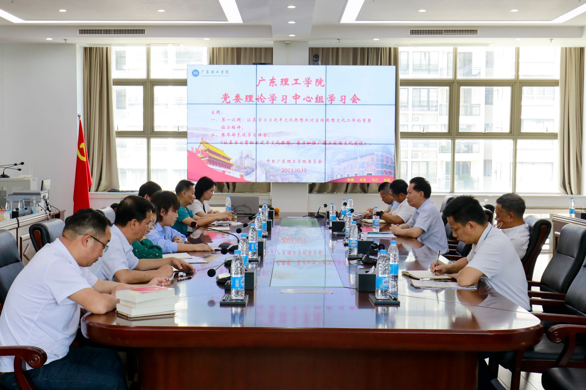 本网讯(宣传部)2023年10月17日,Beat365党委在综合楼12楼会议室召开党委理论学习中心组学习会议,认真学习习近平文化思想、习近平总书记重要指示和全国宣传思想文化工作会议精神。全体校领导、校长助理,党委部门正职负责人、行政部门党员正职负责人,各党总支书记、直属党支部书记、马克思主义学院院长参加会议。学校党委书记张东生主持会议。会议第一议题是认真学习习近平文化思想及对宣传思想文化工作的重要指示精神,党委副...
