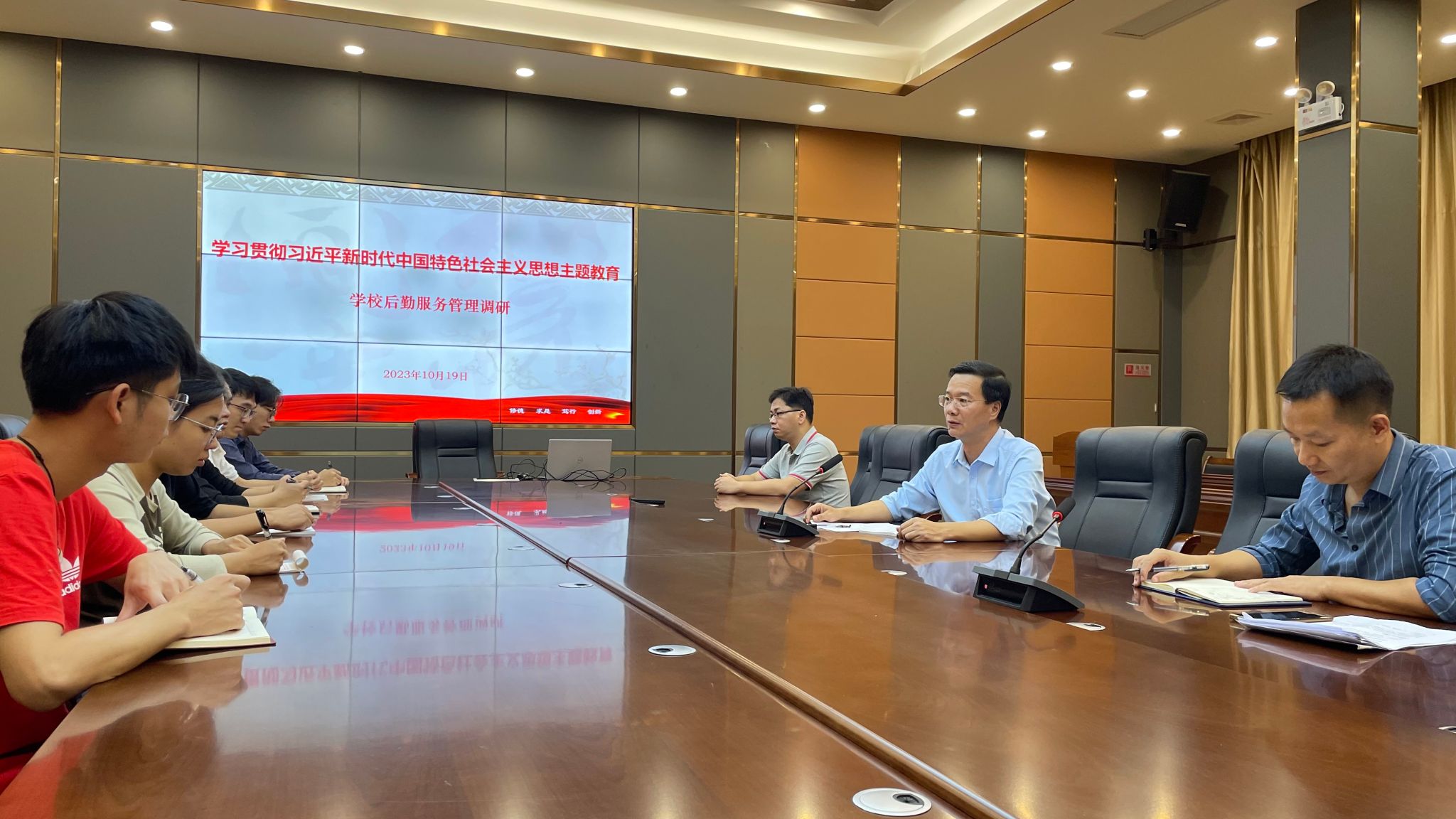 本网讯(后勤处/宣传部)2023年10月19日下午,副校长谭锦兴于行政楼一楼会议室开展后勤服务管理工作调研。校长助理梁伟雄、后勤处及资产设备管理处各科长及职员代表参与调研工作。本次会议主要围绕后勤服务团队日常运行中遇到的困难进行深入探讨及研究,并结合迎评工作推动学校后勤服务高质量发展提出意见与建议。会上,相关工作人员首先就近年来后勤服务工作取得的经验成效和存在的困难问题进行工作情况汇报。谭锦兴认真听取了...