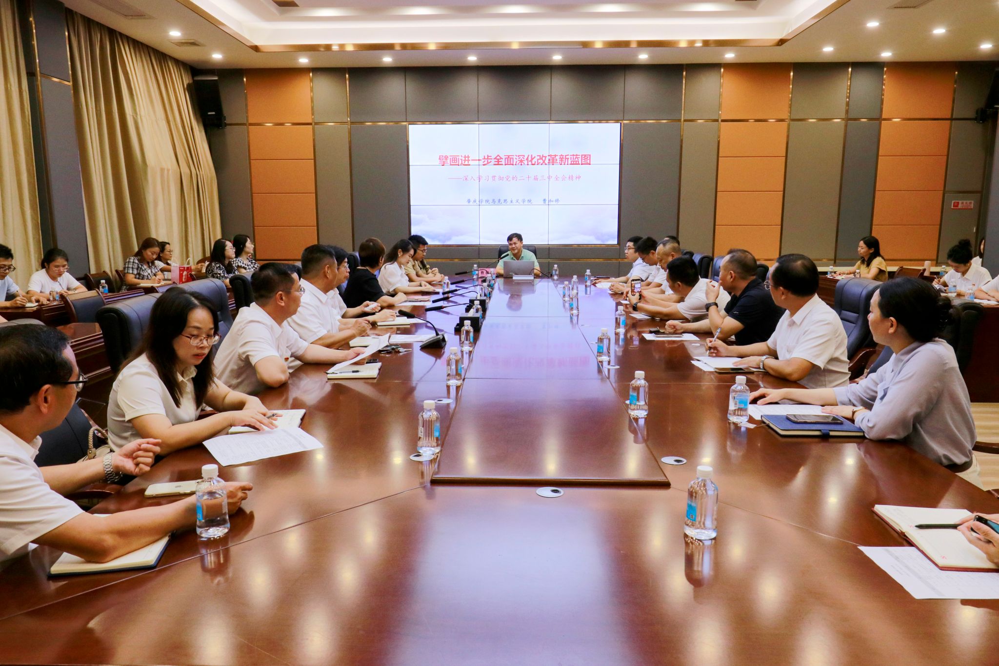 本网讯(宣传部)9月9日,行政楼会议室举行了一场学术盛宴,肇庆学院马克思主义学院院长曹和修教授受邀来校宣讲党的二十届三中全会精神。曹教授以“擘画进一步全面深化改革新蓝图,深入学习贯彻党的二十届三中全会精神”为主题,深入浅出带领Beat365教师理解党的最新政策和指导思想。党委书记胡海建,副书记张宗珊、黎会友,党群系统各部门负责人,各二级学院党总支书记、马克思主义学院教师以及党的二十届三中全会精神校内宣讲团...